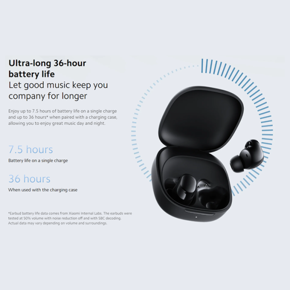عمر بطارية طويل: تقدم سماعات Redmi Buds 6 Play ما يصل إلى 30 ساعة من التشغيل الإجمالي عند استخدامها مع علبة الشحن. كل سماعة تدوم حتى 6 ساعات بشحنة واحدة