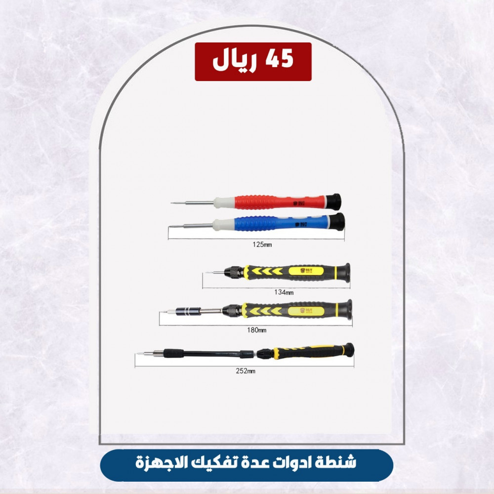 شنطة بها مجموعة أدوات مفكات خاصة في فتح جميع أنواع الهواتف المحمولة ومعظم أجهزة الكمبيوتر المحمول والكمبيوتر الشخصي وغيرها من الأجهزة، بها 38 قطعة رأس مفك براغي مختلفة والتي يمكن استخدامها لاكثر المنتجات الرقمية والالكترونية وحتى وإصلاح النظارات. رؤوس مفكات البراغي مصنوعة من فولاذ Cr-V عالي الجودة، والمقبض مصنوع من المطاط. لها أطراف مغناطيسية قوية ومقابض مانعة للانزلاق. يساعد على فتح غطاء الهاتف المحمول بسهولة دون إتلافه. الأدوات الاحترافية تجعل عملك أكثر سهولة. يأتي مع صندوق تخزين ، يسهل حمله وتخزينه في المنزل والعمل.