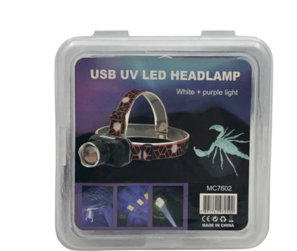 هذا المنتج عبارة عن مصباح رأس متعدد الوظائف يجمع بين إضاءة LED بيضاء وإضاءة LED فوق بنفسجية (UV) أو "الضوء الأرجواني". يتم شحنه عبر منفذ USB ويأتي في علبة بلاستيكية شفافة للحماية والتخزين. يُظهر تصميم العبوة صورة لمصباح الرأس على رأس شخص، بالإضافة إلى صور توضيحية لاستخدامات الضوء فوق البنفسجي، مثل الكشف عن العقارب وإضاءة الشرائح الإلكترونية (LEDs).